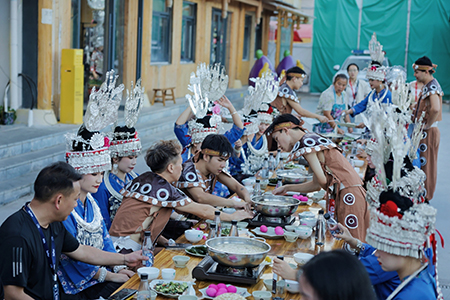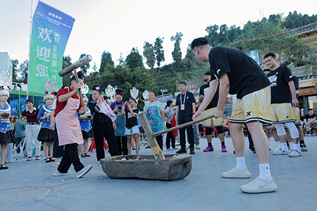 赛场之外,“村BA”大集同步热闹开市。“苗族长桌宴”的姊妹饭、酸汤菜、苗王鱼、糍粑、腊肉等特色美食缤纷陈列、香气四溢,金刺梨、鲤吻香米、生态鲟鱼等“贵州黔货”琳琅满目,吸引众多游客驻足品尝、踊跃选购,融入了篮球主题的苗绣、银饰锻制、蜡染等文创产品,让传统工艺焕发新活力,稻田打谷、萌趣捉鸭、趣味投篮等“村趣”活动,吸引大人孩子齐上阵,现场人气爆棚,充满欢声笑语。全国“村BA”坚持农文体旅治融合发展,通过村集、和美乡村建设成果展、跟着赛事去旅行、送体育下乡等同期活动,弘扬农耕文化,推动农特产品展销、非遗体验与乡村旅游深度融合,实现了“赛事IP+消费产品”的有效转化,切实将“赛事流量”变为“发展增量”。